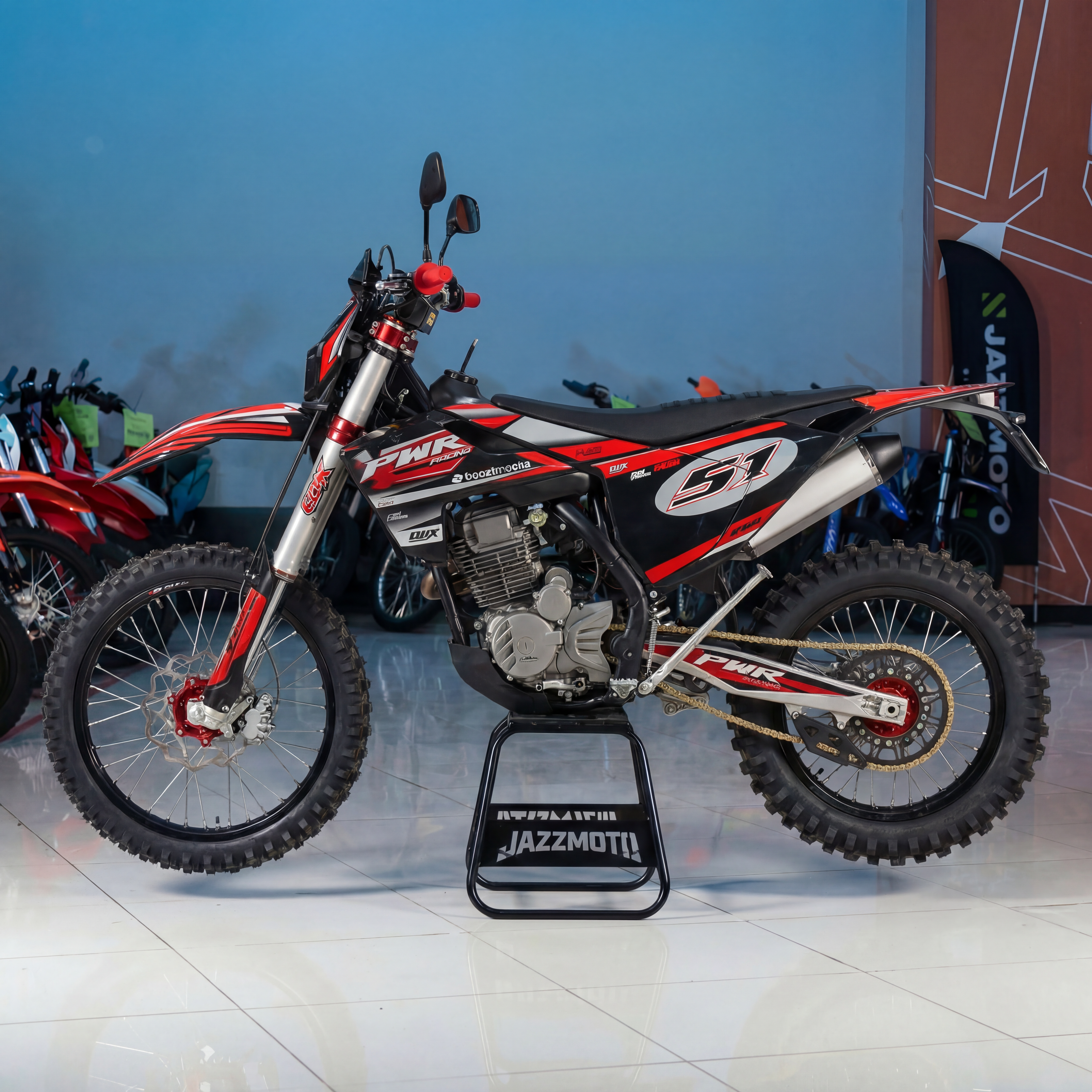 На PWR FS 250 установлен мощный 4х клапанный двигатель с воздушным охлаждением ZONGSHEN 172FMM-4V. Такая конфигурация хорошо подходит для активной езды по пересеченной местности, когда важны стабильная работа, простота обслуживания и уверенное поведение мотоцикла в разных условиях. Характер модели ориентирован на быстрый и агрессивный темп, при этом байк остаётся понятным в управлении и удобным для повседневной внедорожной эксплуатации.