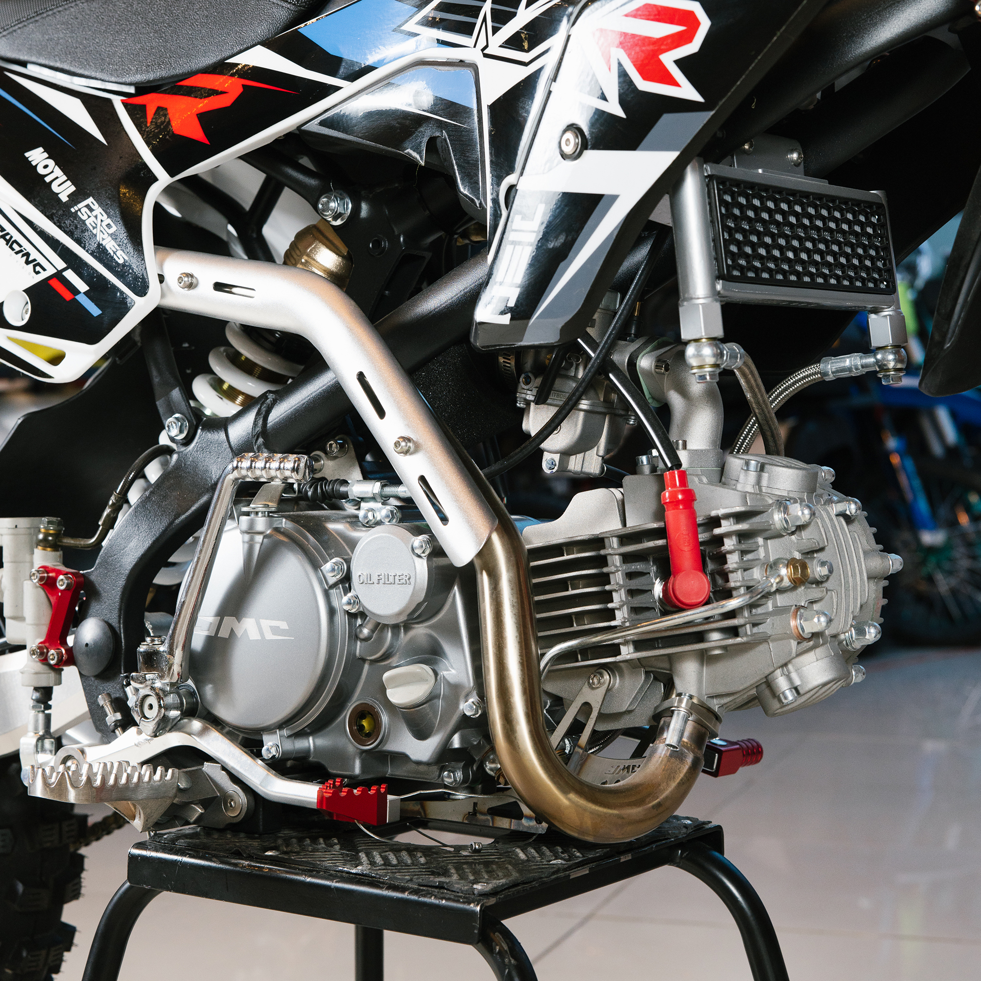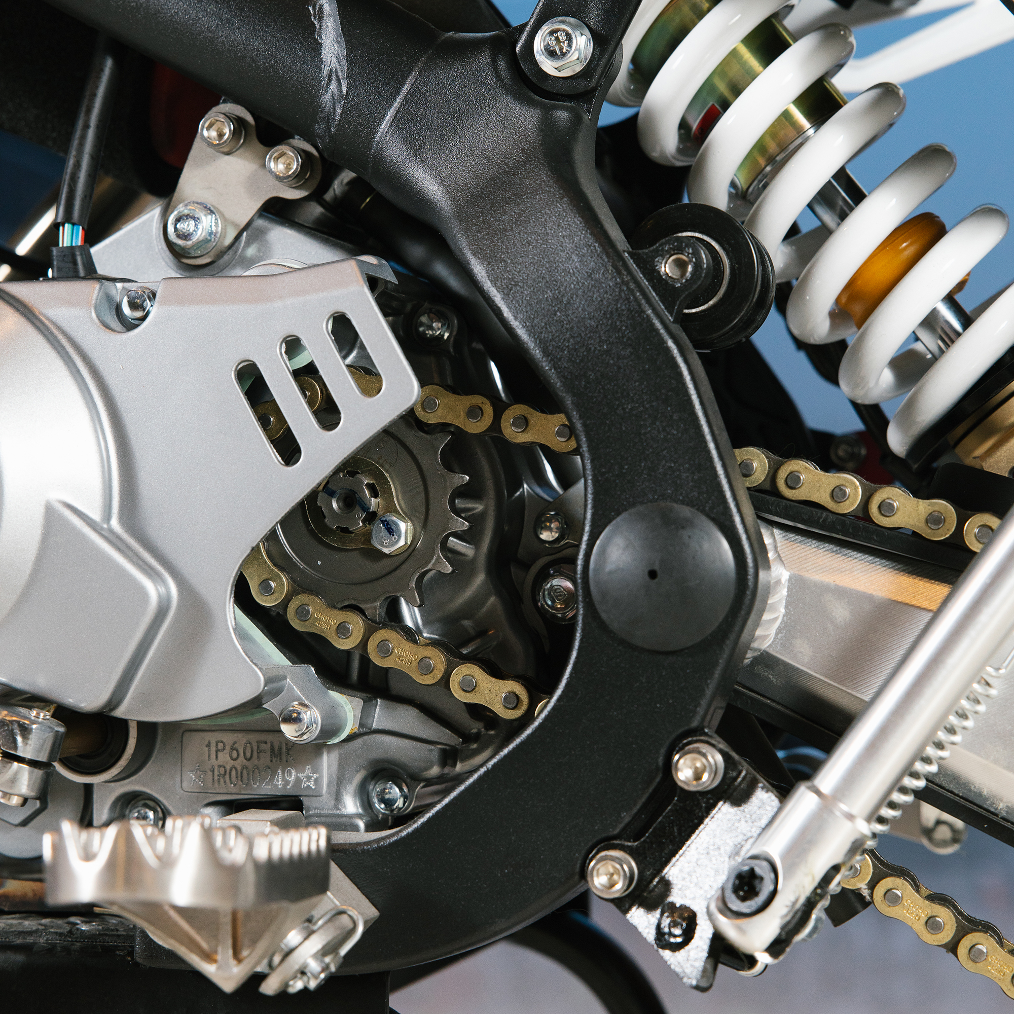 Особое внимание уделено конструкции рамы: усиление силовых крепежных элементов и изменение геометрии обеспечили улучшенную посадку, комфортную стойку райдера, а также стабильное и предсказуемое управление. В базовой комплектации модель оснащена оригинальным карбюратором NIBBI PE24 с оптимальными настройками, дисковыми гидравлическими тормозами и двигателем YX 1P60FMK объемом 160 куб. см с механической коробкой передач (N-1-2-3-4). Радиатор охлаждения эффективно предотвращает перегрев двигателя при интенсивной эксплуатации в жаркую погоду.