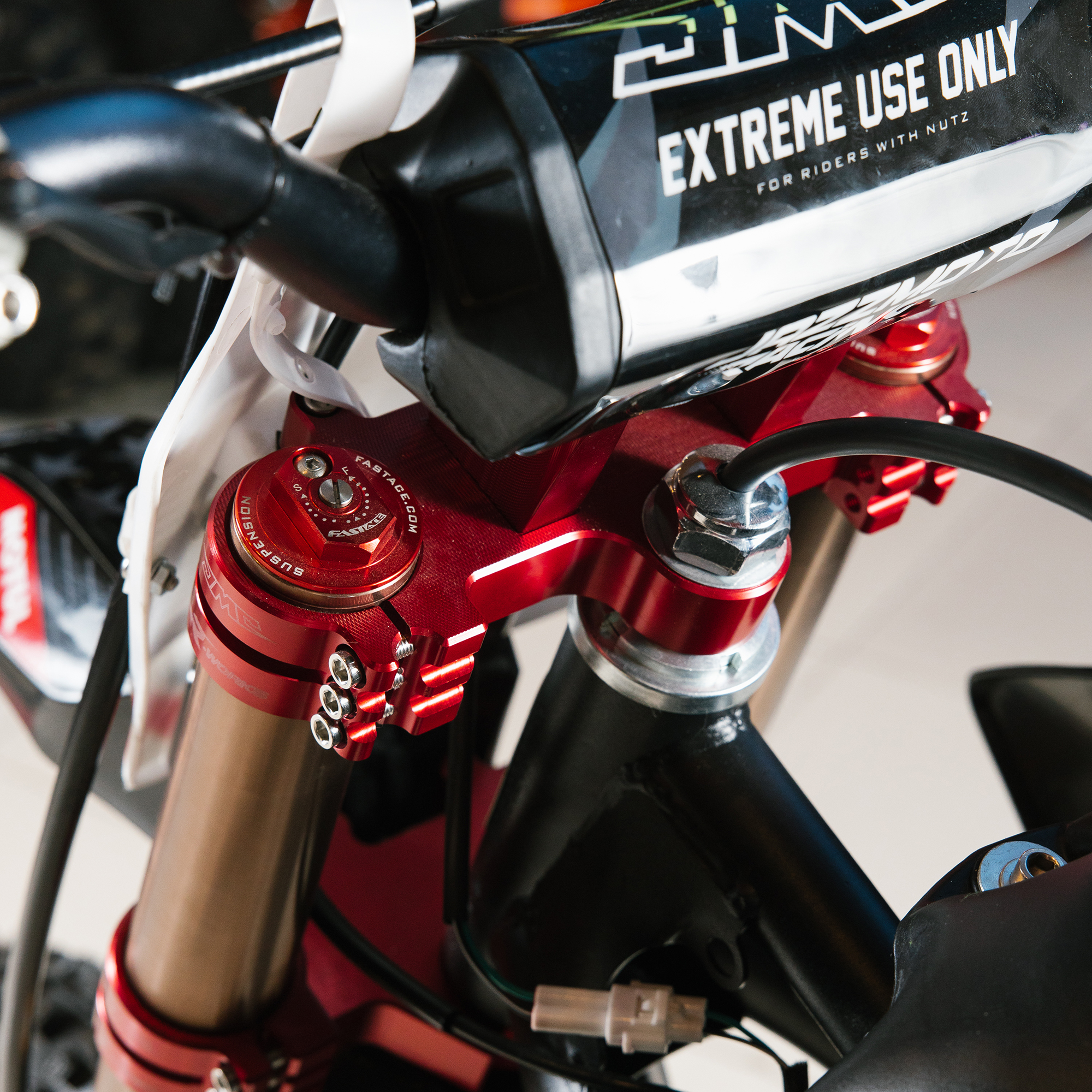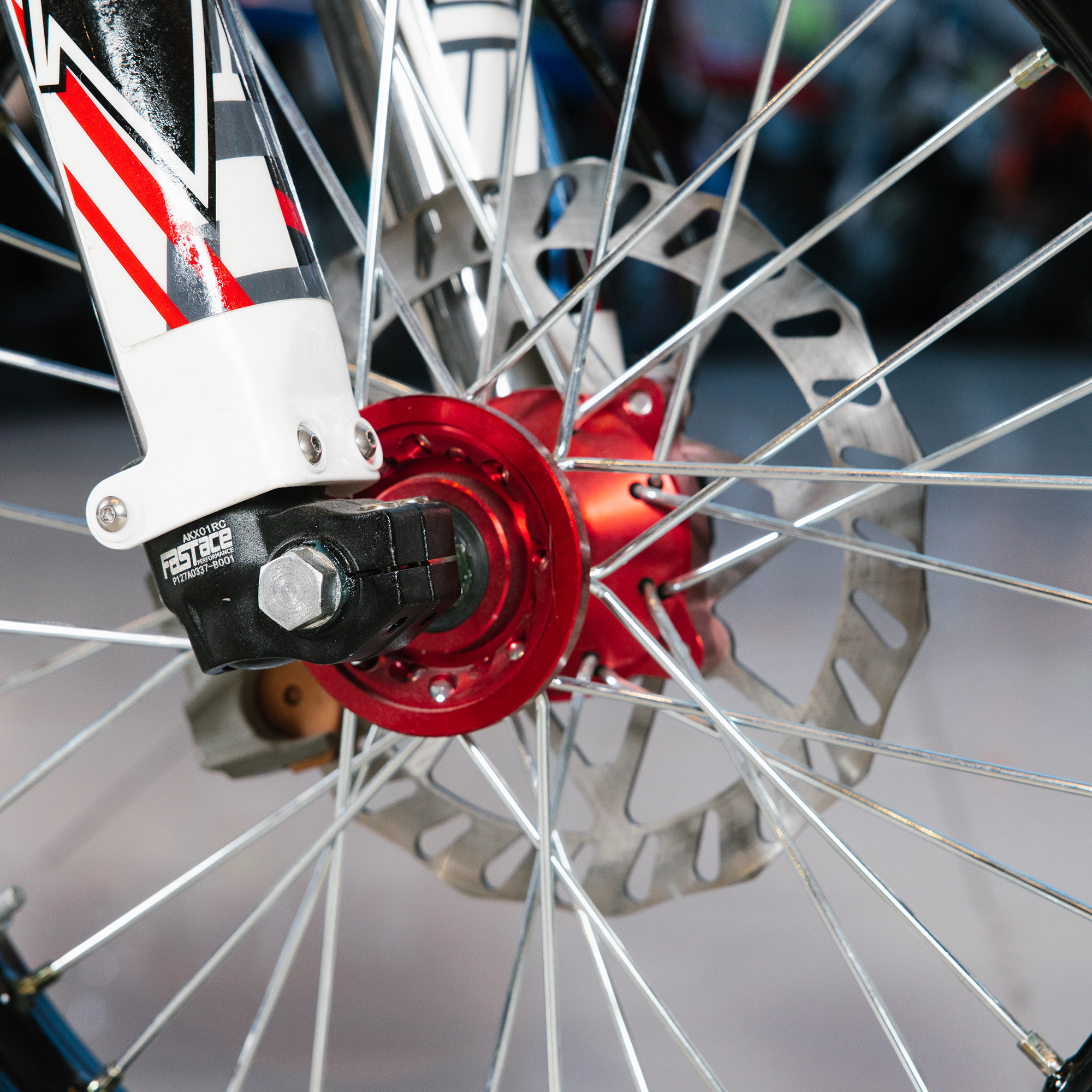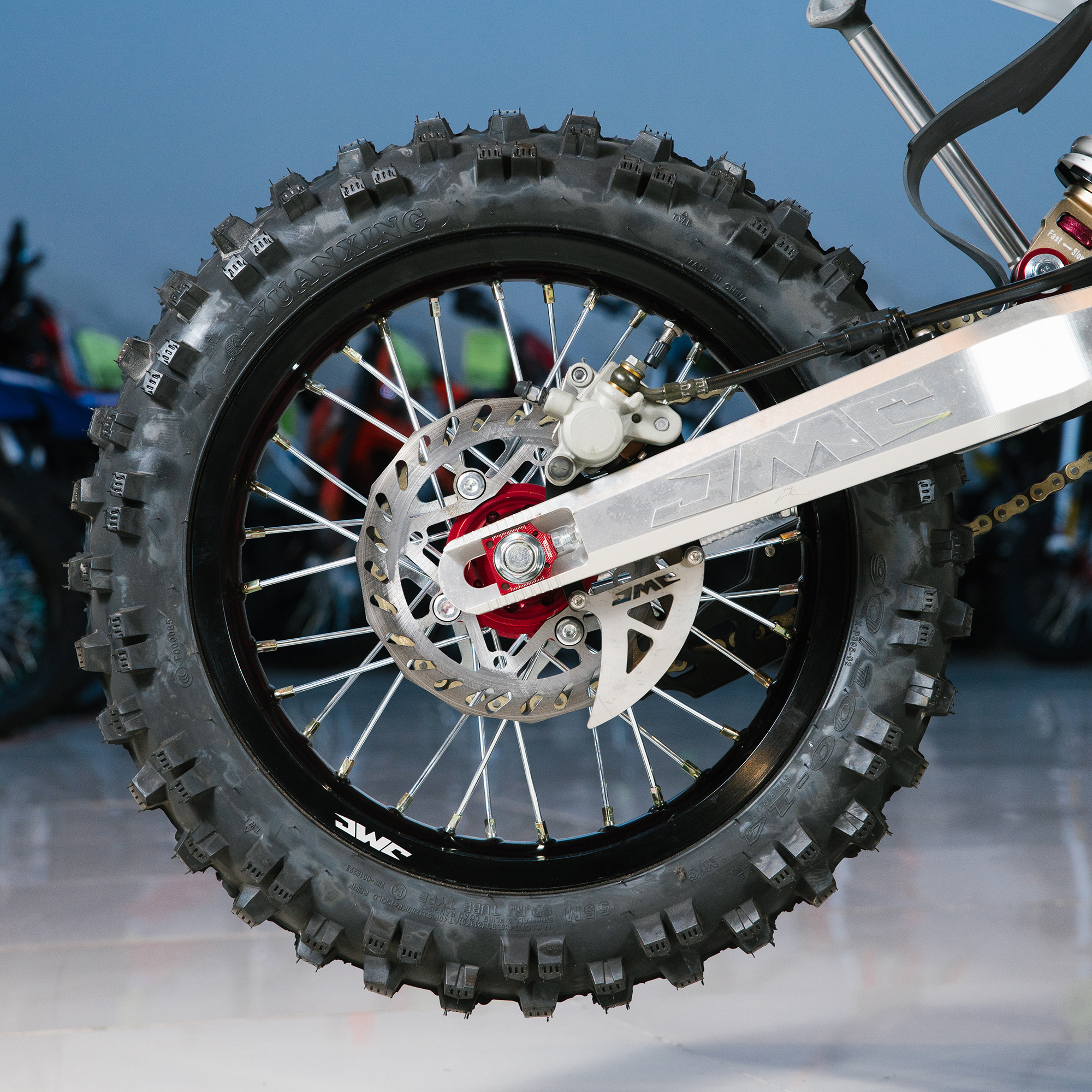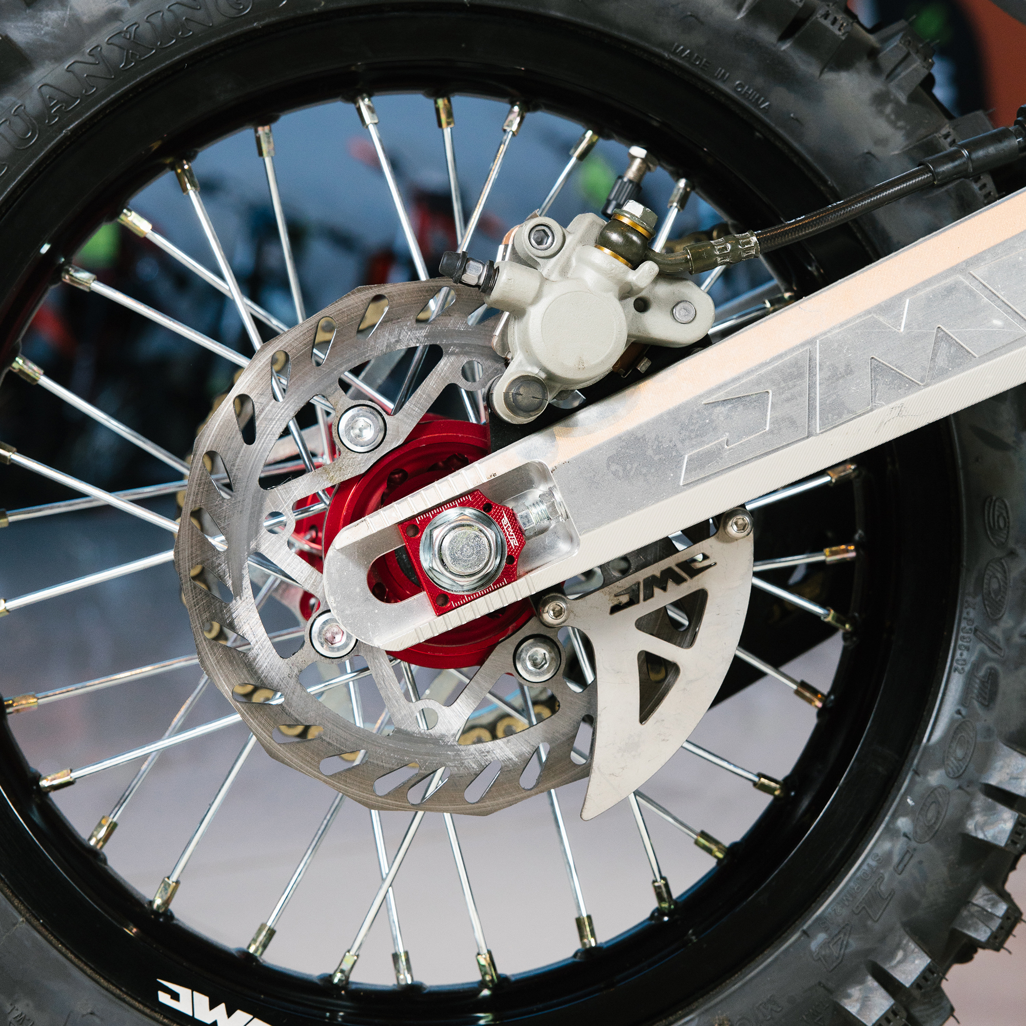 Подвеска питбайка обеспечивает высокий уровень комфорта и надежности: передняя телескопическая перевернутая вилка Fastace длиной 800 мм имеет регулировки отбоя и сжатия, а задний моноамортизатор DNM DHL 360 — регулировки отбоя, сжатия и скорости отбоя. Алюминиевый маятник с усиленной 15-миллиметровой осью рассчитан на значительные нагрузки, а колеса с прочными алюминиевыми ободами из сплава 7116, усиленными спицами и качественной резиной с агрессивными грунтозацепами обеспечивают надежность и уверенное прохождение сложных участков.